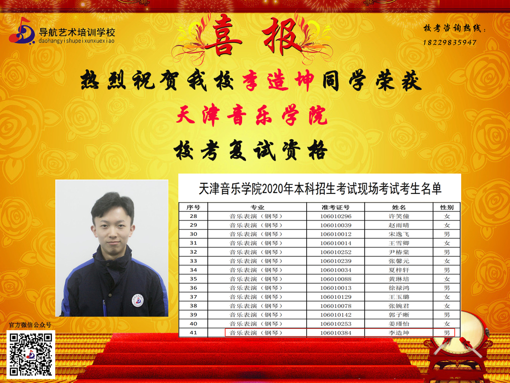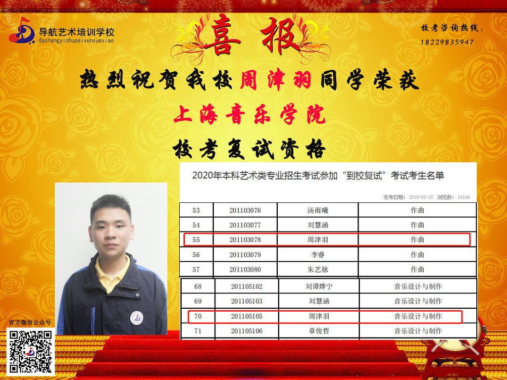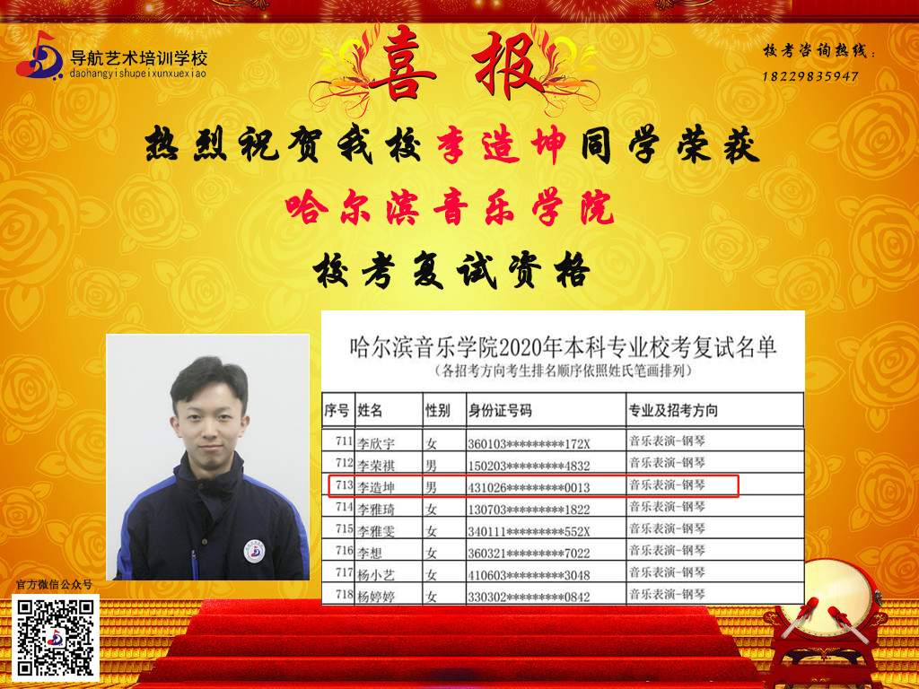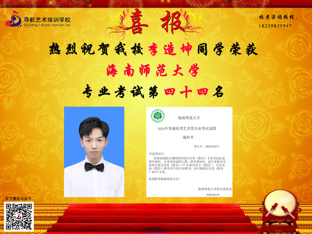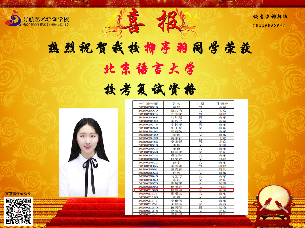 隨著時間的推移,?汲煽兊年懤m更新,長沙市岳麓區導航藝術培訓學校在2020屆的?贾腥〉昧溯x煌的成績,因其他原因漏榜的同學,記得聯系小編哦。大家可以關注我們的微信公眾號及官網,看看你,是否榜上有名!