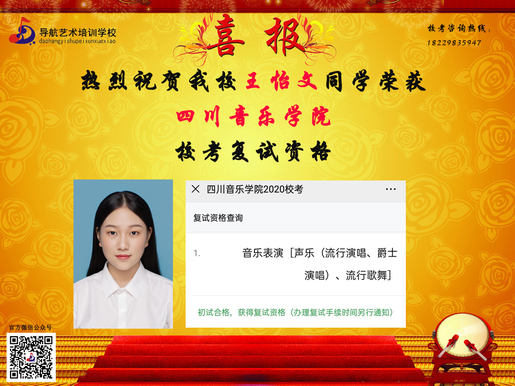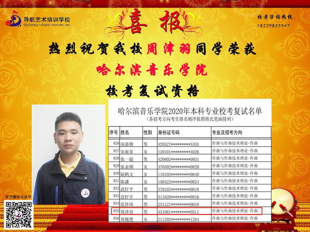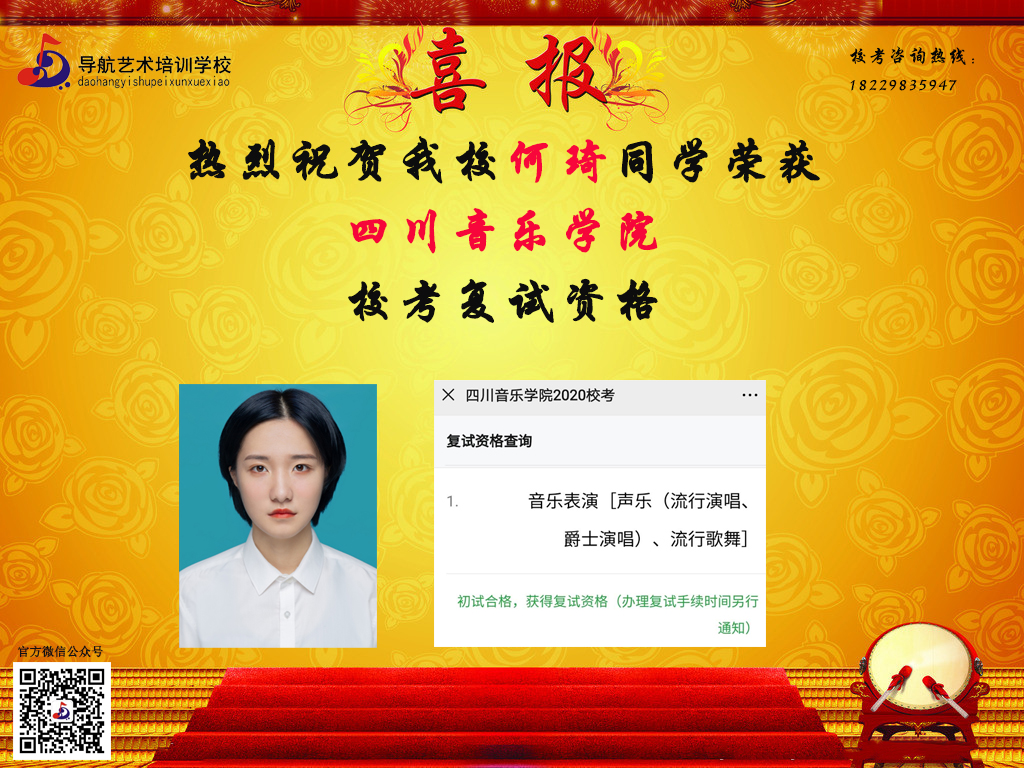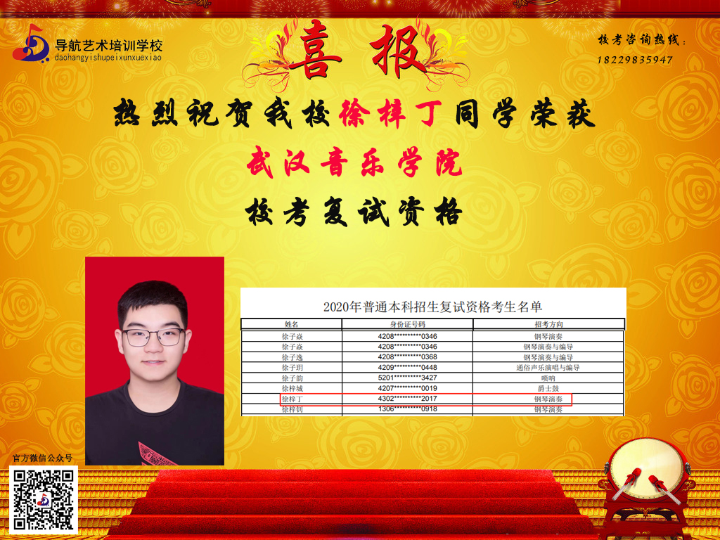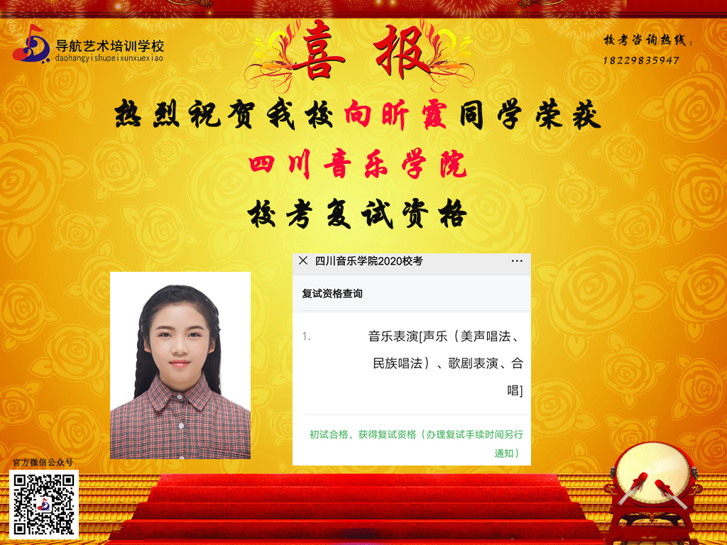 隨著時間的推移,?汲煽兊年懤m更新,長沙市岳麓區導航藝術培訓學校在2020屆的?贾腥〉昧溯x煌的成績,因其他原因漏榜的同學,記得聯系小編哦。大家可以關注我們的微信公眾號及官網,看看你,是否榜上有名!